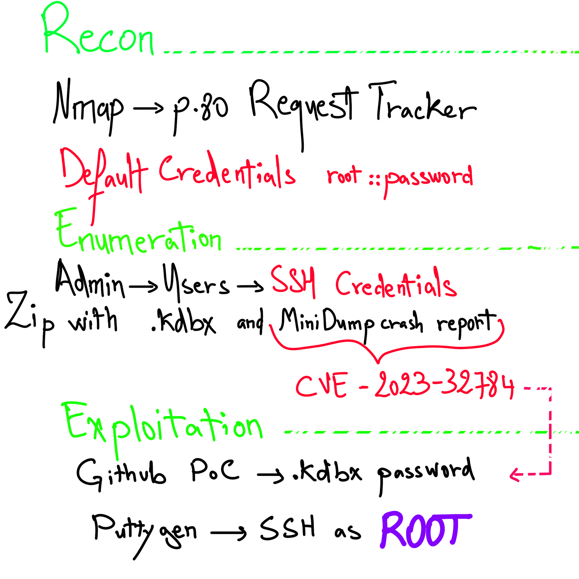 Easy Linux box abusing default creds on Request Tracker, KeePass dump (CVE‑2023‑32784) to retrieve root SSH key.